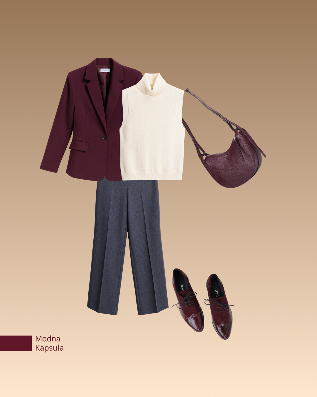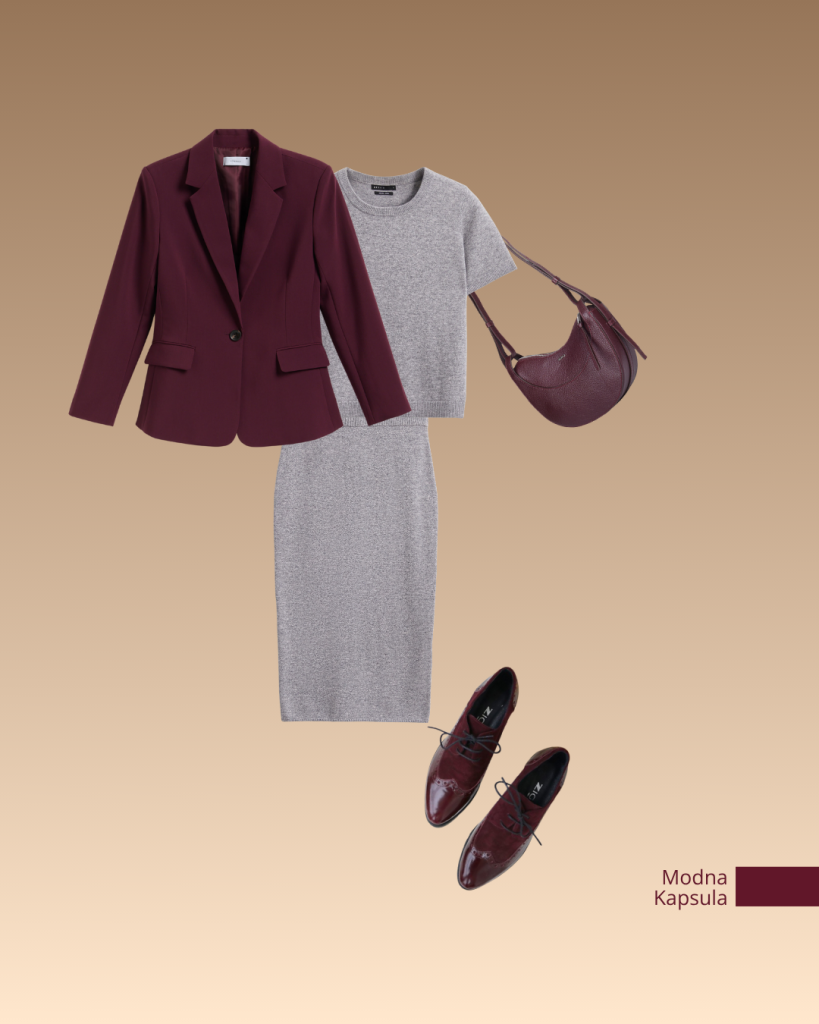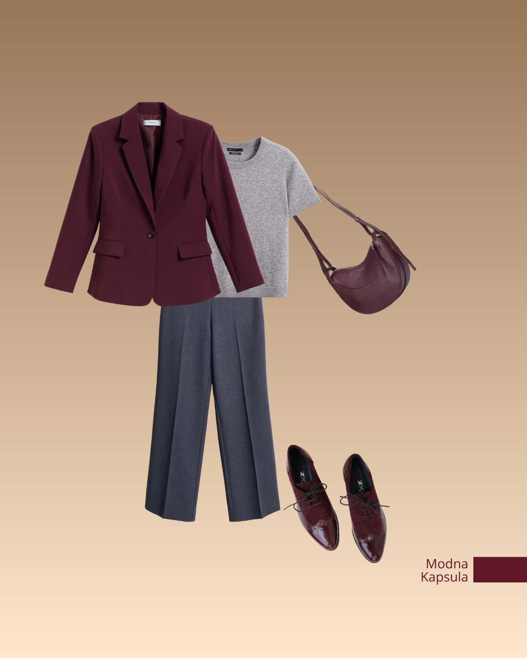 Burgundi blejzer u kombinaciji sa sivim pantalonama i sivom bluzom daje utisak klasične, ali ne stroge elegancije.