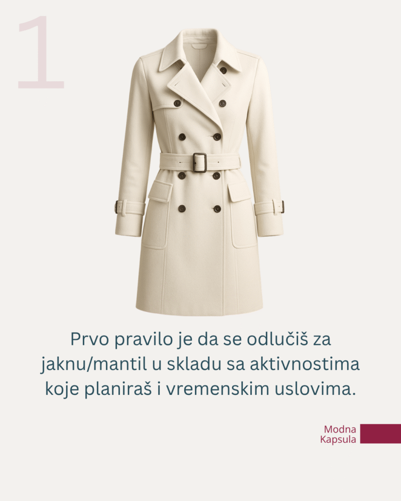 Sve počinje od jedne odluke: izbora jakne, mantila ili kaputa. Ne biramo ga po tome što je lep na vešalici, već biramo prema aktivnostima koje planiramo i vremenskim uslovima. Ovo je osnova oko koje se gradi sve ostalo.