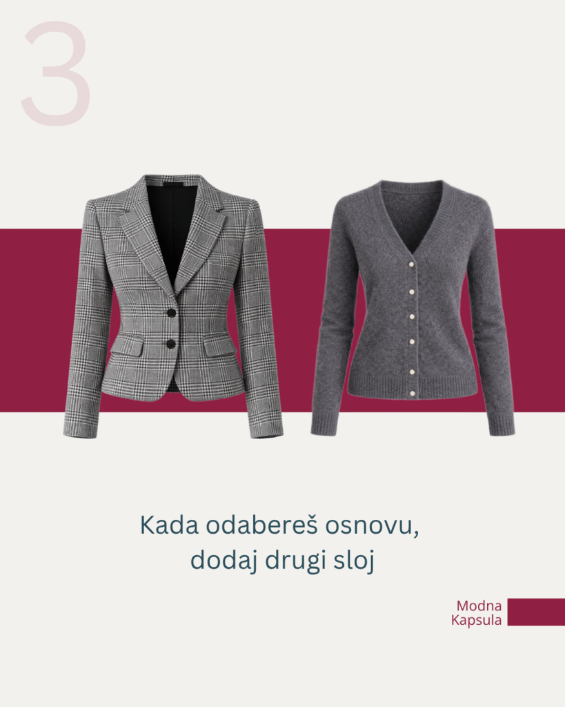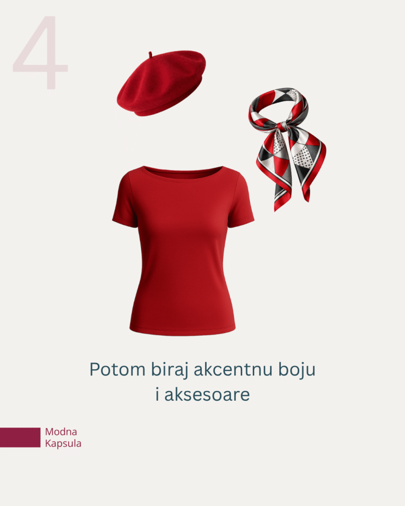 Potom dolazi akcentna boja, kroz aksesoare ili jednu bluzu. Ona sve poveže i daje karakter celoj kapsuli.