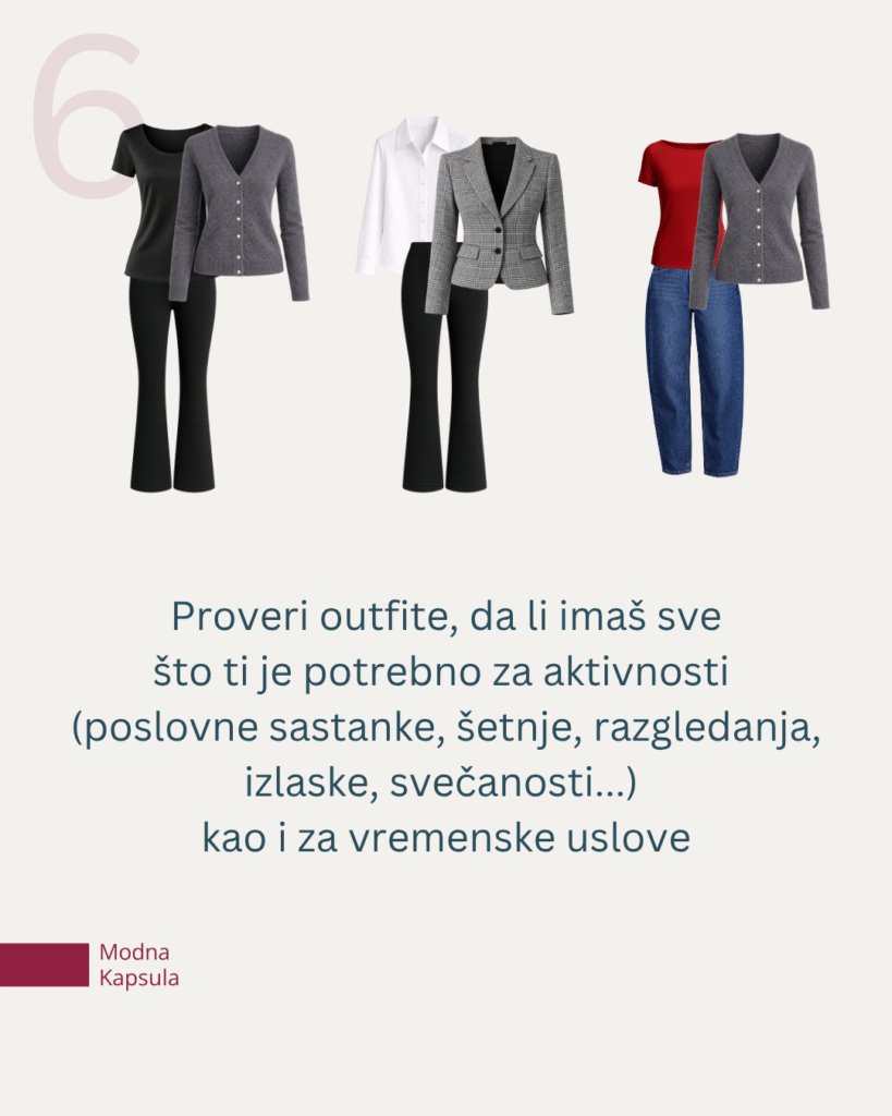 Kada složiš kapsulu, prođi kroz nju jednom: da li imaš outfit za poslovni sastanak? Za šetnju? Za večeru? Za kišoviti dan?