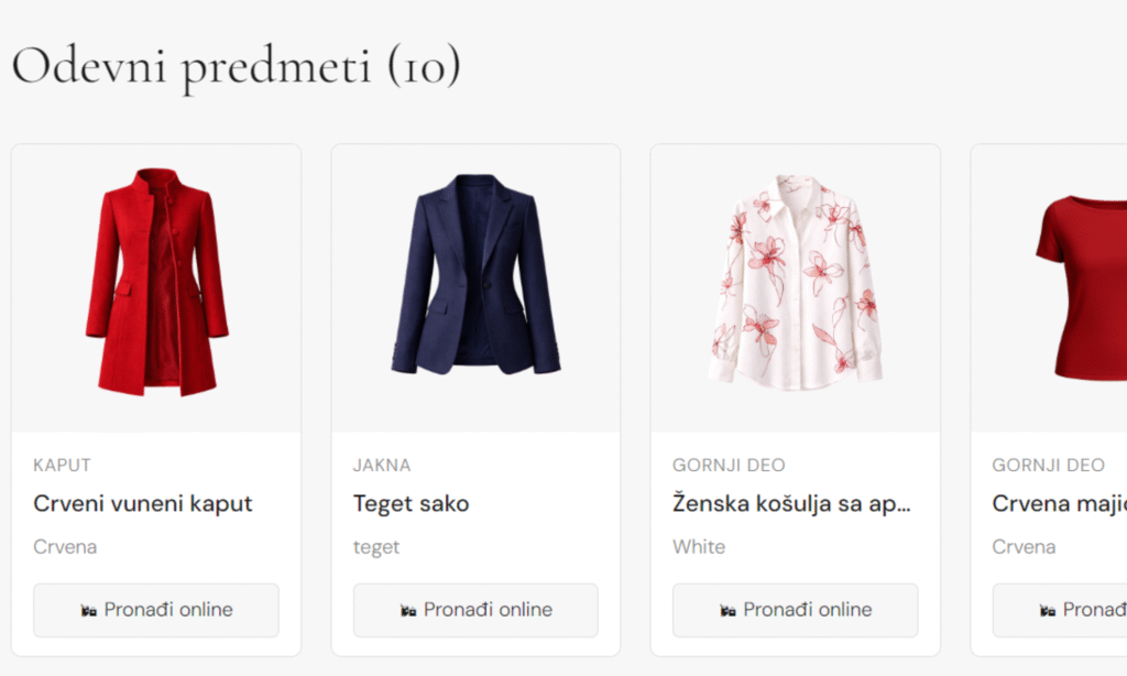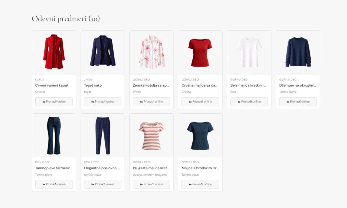 Za svaku ilustraciju u kapsuli možeš da klikneš na Pronađi online i odmah dobiješ Google Shopping rezultate za taj odevni predmet. To je naročito korisno kada tražiš nešto slično u svom budžetu ili od brenda koji preferiš.