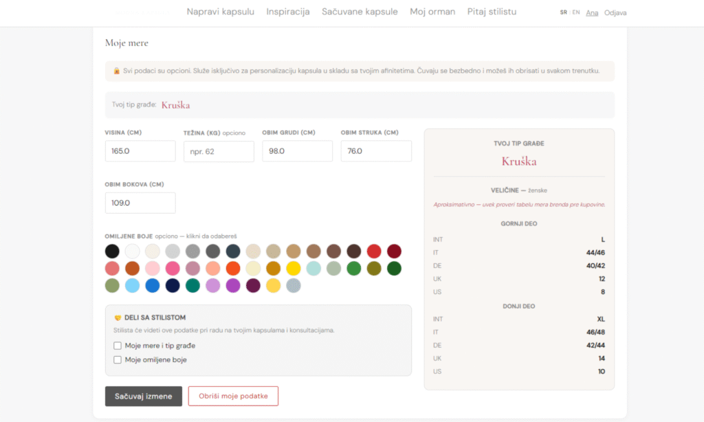 Čim se registruješ, možeš da uneseš svoje mere i dobiješ tip građe kao i aproksimativne veličine u svim sistemima – EU, UK, US, IT, FR. Ovo je korisno kao polazna tačka, posebno kada kupuješ od brendova iz inostranstva. Napomena: ovo su aproksimativne vrednosti – uvek proveri tabelu mera konkretnog brenda pre kupovine.