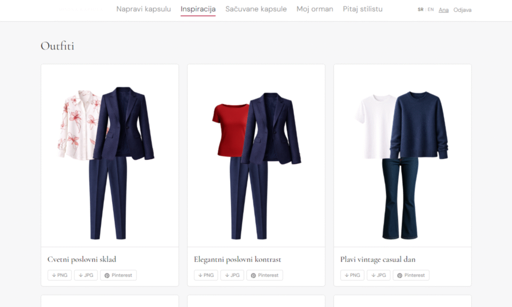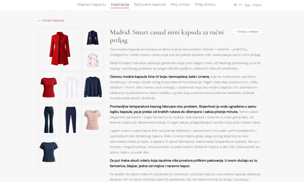 Svaka modna apsula dolazi sa outfitima – gotovim odevnim kombinacijama koje možeš da pregledaš i koristiš kao polaznu tačku.