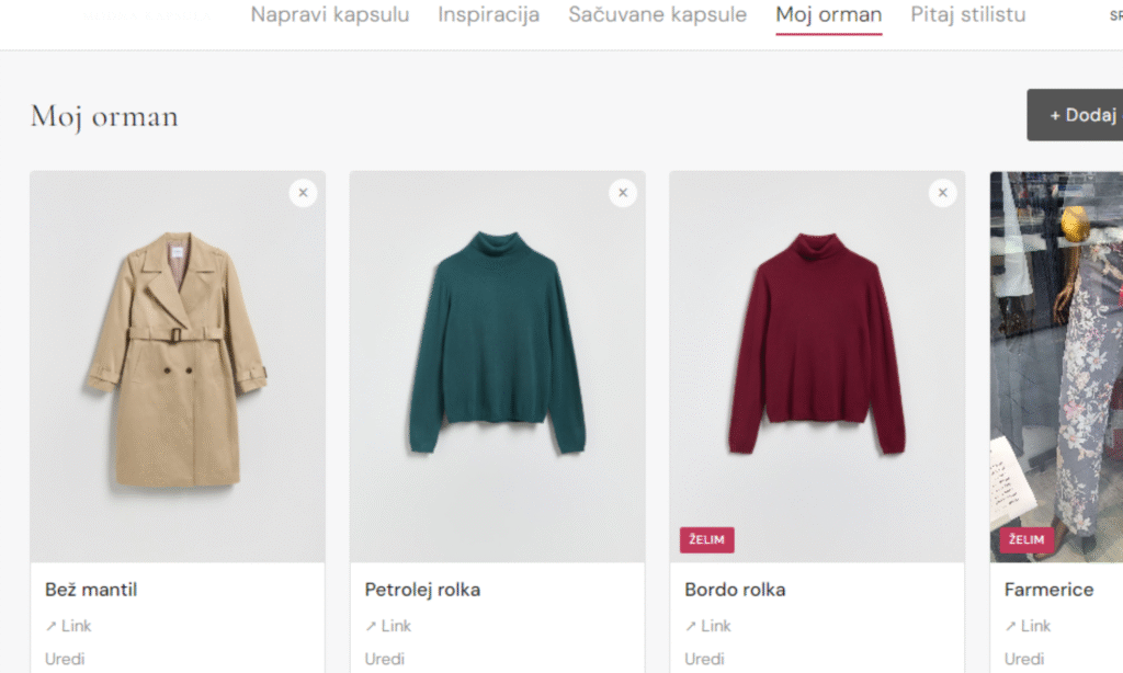 Funkcionalnosti koje će uskoro biti dostupne: Kada složiš kapsulu, moći ćeš da je pošalješ stilistknji na pregled. Ona pogleda šta imaš, ostavi komentar, predloži izmene ili dopune i vraća ti je sa konkretnim savetom, ne sa generičkim pravilima.