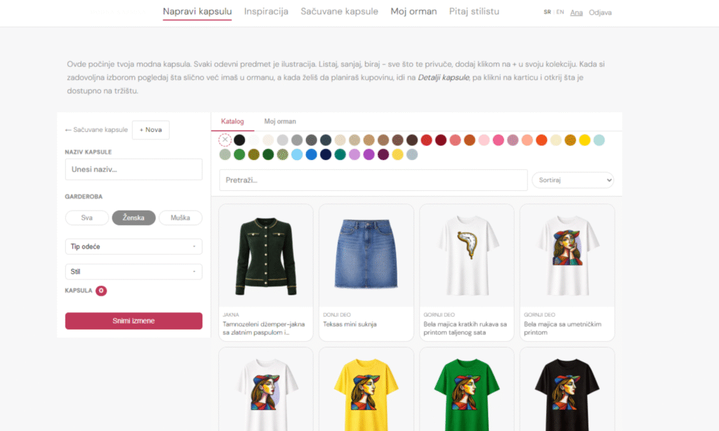 U sekciji Napravi kapsulu kreiraš svoju modnu kapsulu od nule, ili na osnovu inspiracije koju si sačuvala. Dodaješ odevne predmete iz svog digitalnog ormana ili biraš iz naše biblioteke ilustracija.