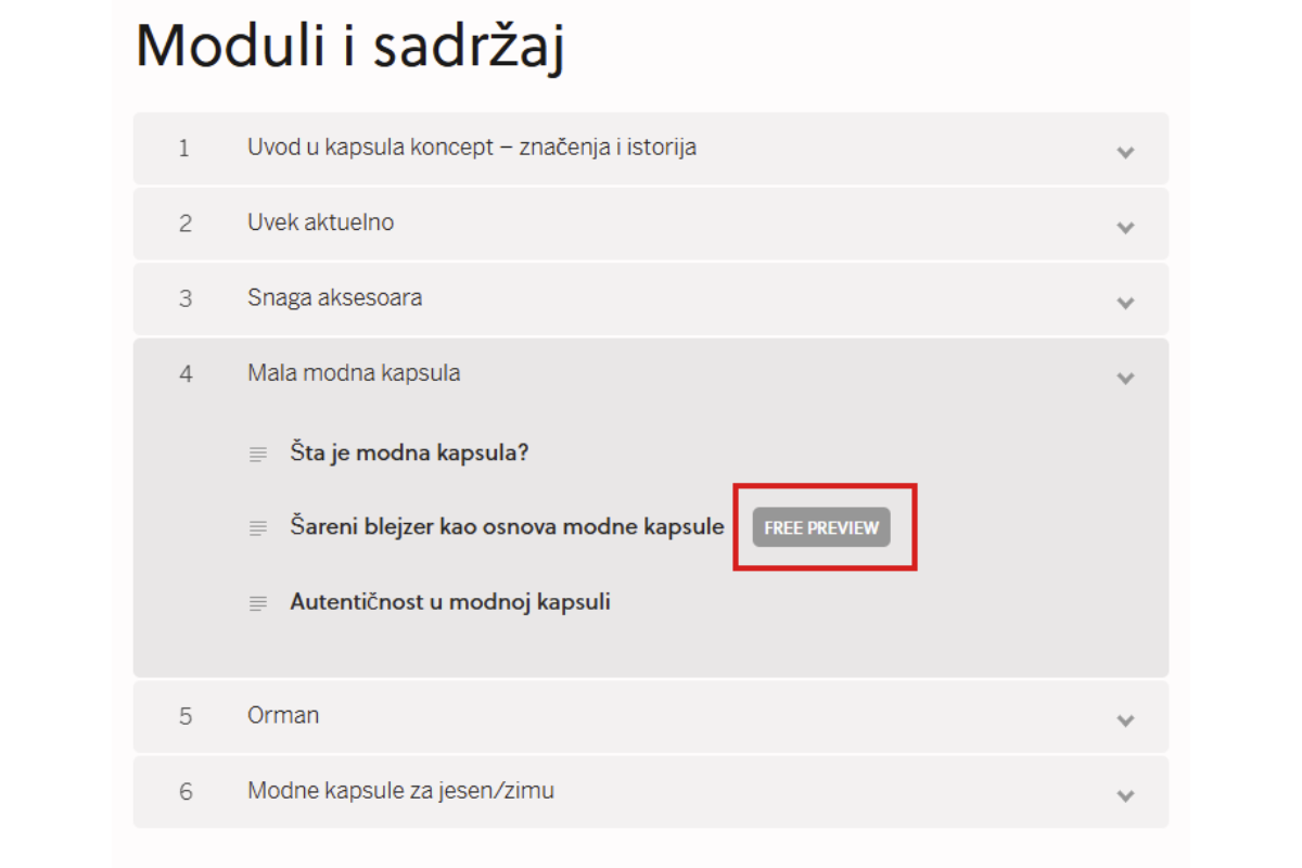 Na listi modula i lekcija potraži sadržaje označene kao Free preview i klikni na jednu od tih lekcija kako bi videla kako program izgleda.