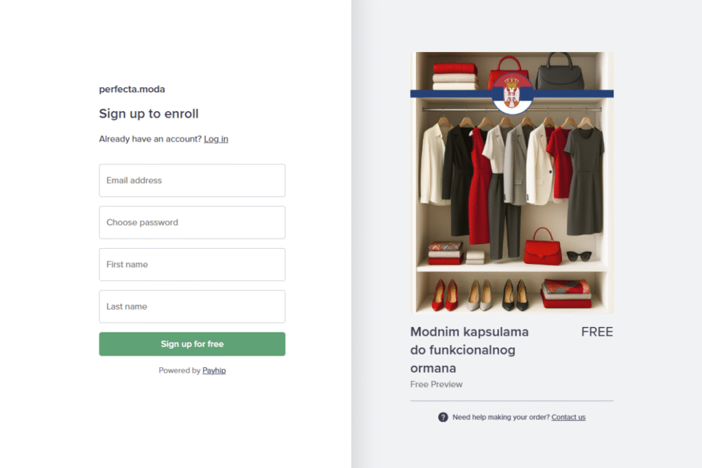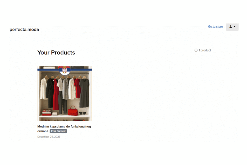 Ako se registruješ prvi put, ovde ćeš videti samo program „Modnim kapsulama do funkcionalnog ormana“. Ako si Payhip ranije koristila za druge sadržaje, na ovoj stranici će se prikazati svi programi i proizvodi kojima imaš pristup.
