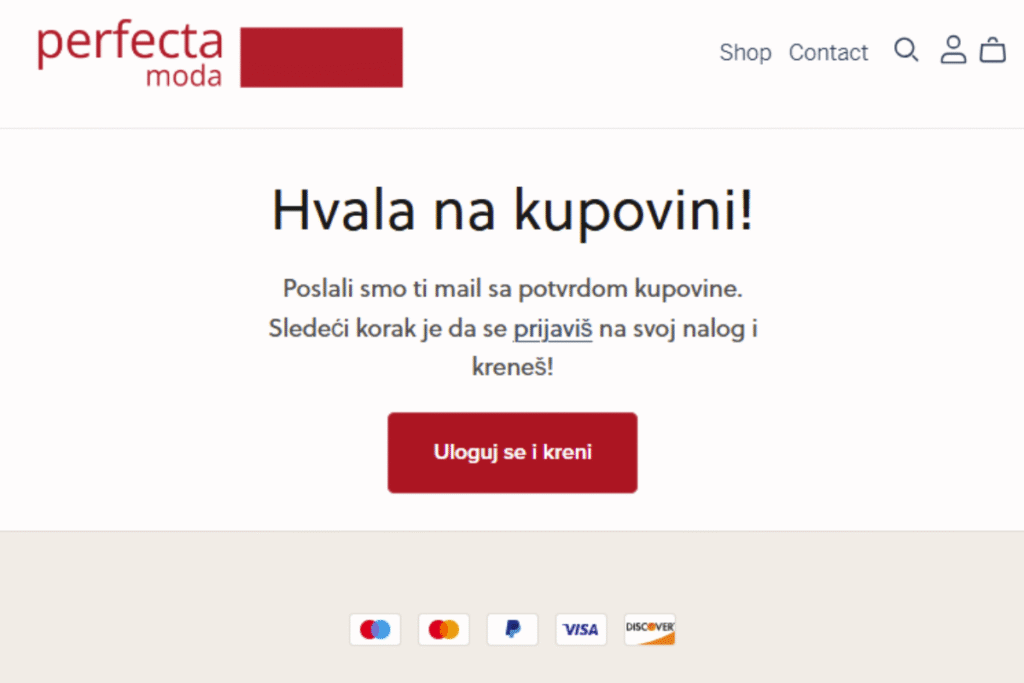 Posle registracije (ili kupovine), otvara se stranica sa porukom „Hvala na kupovini“ i pozivom da se prijaviš na svoj nalog. Klikni na dugme Uloguj se i kreni.