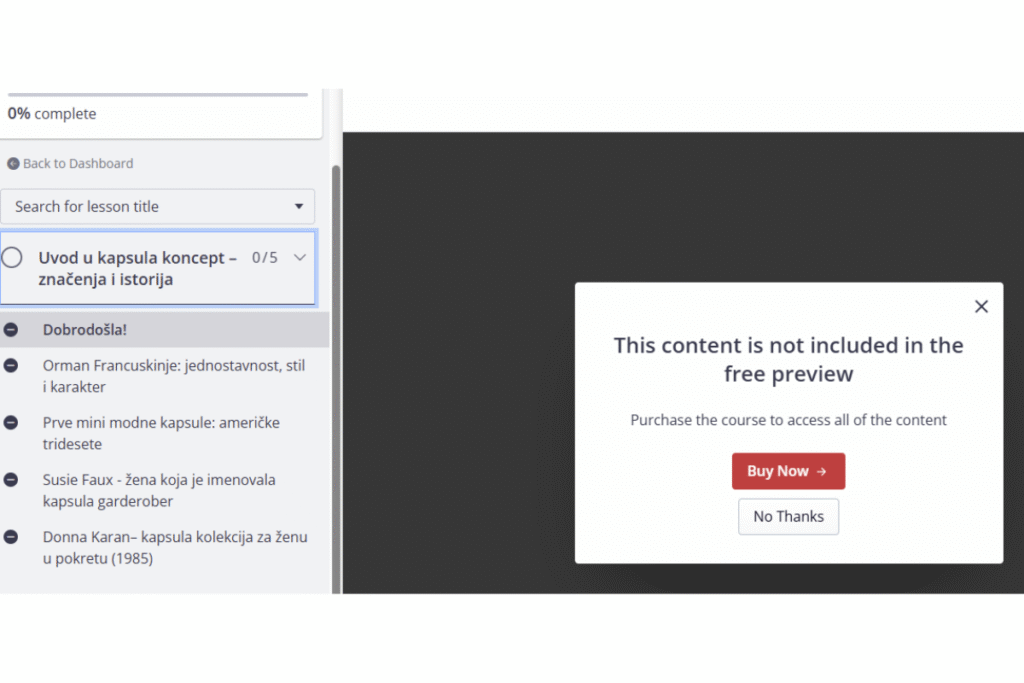 Ako se nakon prijave automatski otvori lekcija i pojavi poruka „This content is not included in the free preview“, to znači da si trenutno na lekciji koja nije deo besplatnog pregleda.