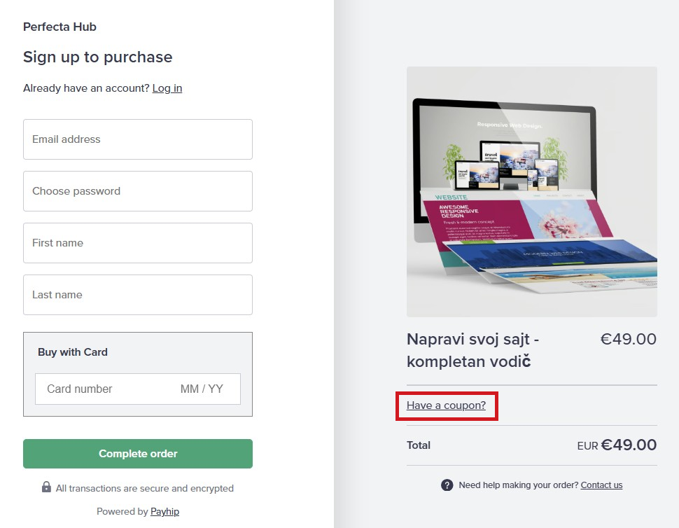 a zatim unesi svoj mejl, password, i ostale potrebne podatke. Mailom i passwordom kreiraš nalog na Payhip platformi.